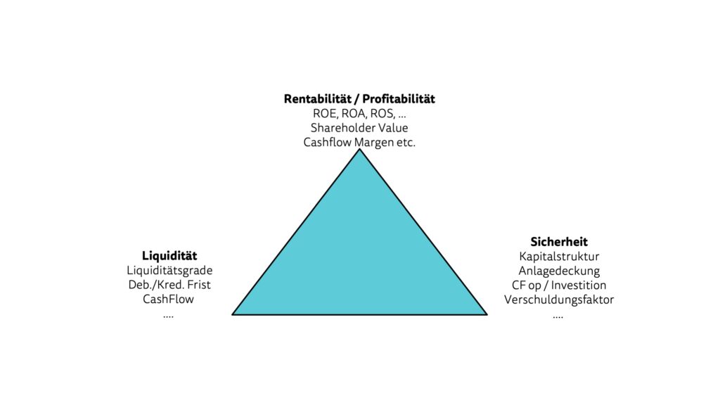 Um Kennzahlen für das Unternehmen zu berechnen, empfehlen wir die Grundidee des “magischen Dreiecks” anzuwenden. Das “magische Dreieck” hat zum Ziel, eine ausgewogene Balance zwischen den Dimensionen Liquidität, Rentabilität und Sicherheit zu gewährleisten. Um das langfristige “Überleben” des Unternehmens zu sichern, ist eine möglichst gute Balance zwischen diesen drei Zielsetzungen notwendig.