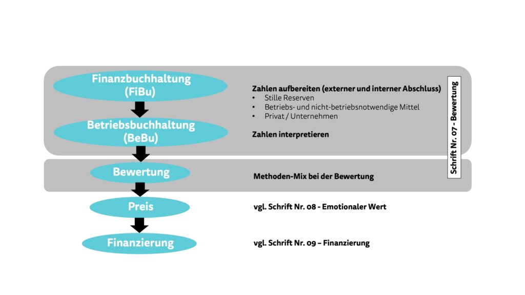 Wir machen die Erfahrung, dass eine Unternehmensbewertung oft Erwartungshaltungen im Bezug auf den Verkaufspreis schafft, die dann nicht eingelöst werden können. Eine Folge davon kann sein, dass ein Nachfolgeprozess abgebrochen wird. Wir empfehlen deshalb, den Preis einer Firma schrittweise und auf der Basis verschiedener Elemente zu erarbeiten.