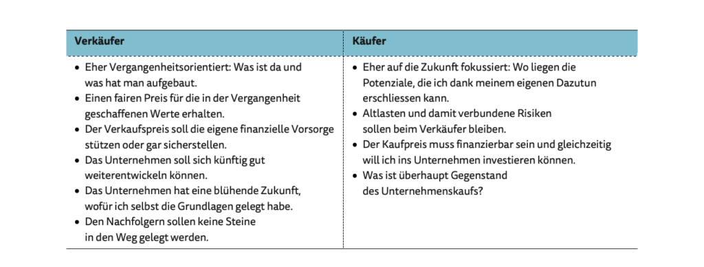 Je nachdem, ob ich Käufer:in oder Verkäufer:in bin, stehen bei der Preisdefinition unterschiedliche Fragen im Zentrum. Die übergebende Generation interessiert sich für die Frage: “Was kriege ich für mein Unternehmen” und die Generation, welche die Firma übernehmen möchte, hätte gerne gewusst, was das Unternehmen kostet und wie sie diesen Preis finanzieren kann. Die Erwartungen an die Bewertung sind also unterschiedlich, je nach Perspektive, aus der man darauf blickt. Das macht den Prozess komplex.
