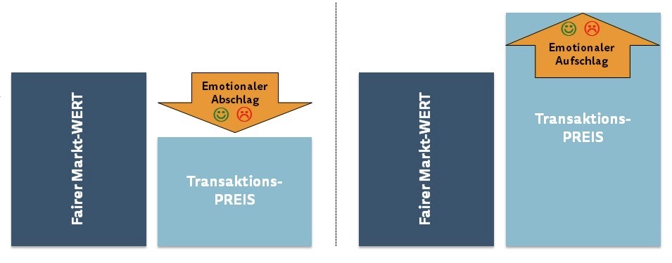 Beim “Emotionalen Abschlag” verzichtet eine Partei auf einen Teil des fairen Marktwertes und damit des Verkaufspreises. Die Gründe dafür können unterschiedlich sein, wie die Beispiele unten zeigen. Beim Aufschlag findet eine Preismaximierung statt.