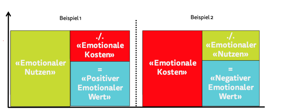 Je nachdem, wie eine Person das Unternehmerdasein erlebt, entsteht ein “Emotionaler Nutzen”, sofern die Emotionen im Hinblick auf das Unternehmerdasein positiv sind. “Emotionale Kosten” entstehen, wenn eine Person das Unternehmerdasein emotional negativ erlebt. Der Saldo dieser beiden Grössen ergibt den “Emotionalen Wert”. Dieser kann positiv oder negativ ausfallen: