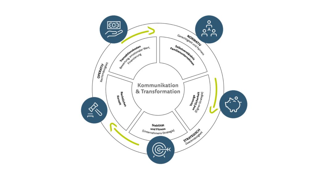 - die Übertragungsebene und damit um die Frage, ob es sich um eine Eigentums‑, Führungs- oder Vermögensnachfolge handelt.